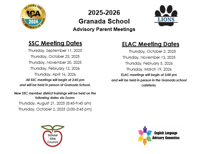 Granada Elementary School needs interested and committed parents/community members to add to the team of School Site Council members. If you are interested or know of anyone that you feel would best serve on this council, for a two-year term, please contact Dr. Soria, Principal at [email protected]